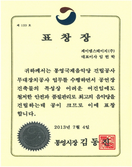 국내 무대업계 최초로 안전보건경영시스템(ISO 45001)을 획득하여 안전보건 법규 준수 및 안전보건 예방 관리를 통해 산업재해를 예방하고 안전한 시공 환경을 조성하고 있습니다.
